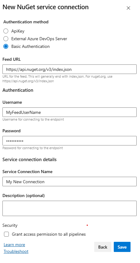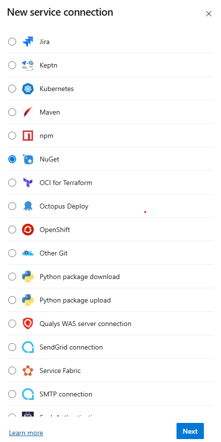 Next, you will need to create a new service connection. Choose NuGet as the type of connection. After clicking “Next” you can then fill out the information for connecting to the NuGet feed.