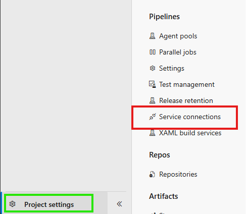 The first task at hand is to ensure that there is a Service Connection between the DevOps instance and the NuGet feed. You will first need to navigate to the Service connections tab. This is done by clicking “Project Settings” then finding “Service connections” under the Pipelines section.